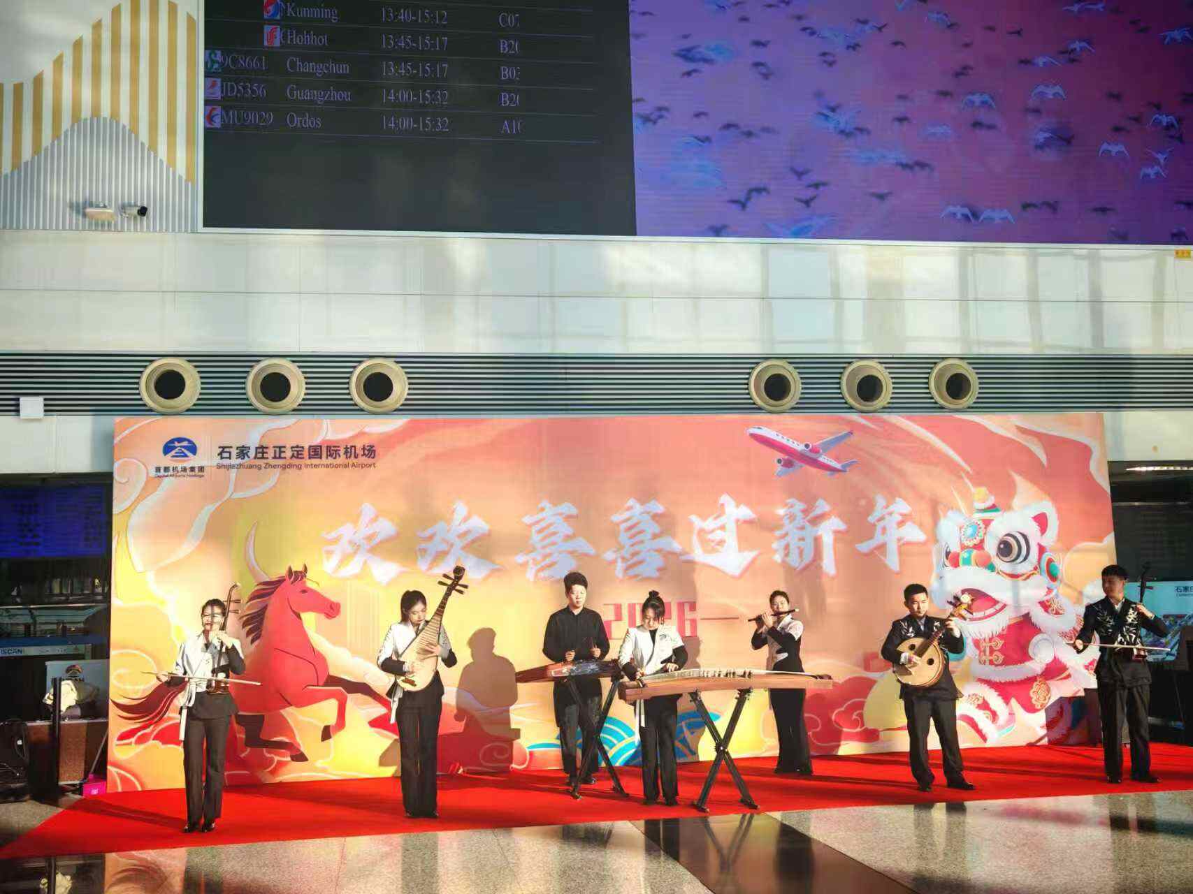 本网讯(河北机场集团:于瑾怡报道)2026年1月1日,一场别开生面的元旦音乐“快闪”演出在石家庄正定国际机场(简称“石家庄机场”)2号航站楼温情启幕。石家庄机场以音乐为媒,精心在值机大厅与到达大厅打造两场风格迥异的听觉盛宴,用动人旋律为过往旅客送上新年诚挚的问候。 1日上午10时整,2号航站楼2楼值机大厅B岛值机柜台前,国风篇章率先奏响。古筝、大鼓、笛子、二胡、琵琶、阮等传统乐器悉数亮相,一曲气势恢宏的《象王行》瞬间抓住往来旅客的目光。铿锵鼓点与悠扬筝声交织碰撞,将东方美学的磅礴气韵展现得淋漓尽致。紧接着,《民乐合