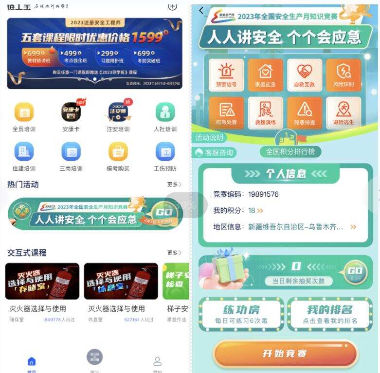 此次竞赛依托全国安全生产月官网和链工宝APP为参赛平台,时间为2023年6月1日至6月30日。竞赛主要内容以各类生产安全事故预防、隐患识别与排查、避险逃生、自救互救、救援演练和应急处置应知应会知识为主。职工通过答题形式进行竞赛,每天可答题1次,每题分值为1分,每次随机5题,直至5道题全部答完。每次总计限时150秒,超过限时视为自动交卷,不超过时限可返回继续答题。每次答题均可为其所在地区获得积分,最终积分将作为比赛成绩统计的依据。