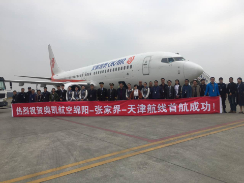 中国民用航空网讯:2017年4月1日起,奥凯航空开通天津往返绵阳航线,航班号为BK2757/8,由波音737-800型客机执飞,计划每周二、四、六各一班。去程09:55从天津出发,12:25经停张家界,14:25抵达绵阳;返程15:15从绵阳出发,16:30经停张家界,19:55抵达天津。