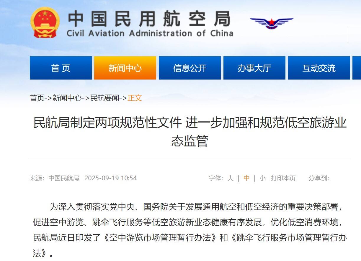 民航局制定两项规范性文件 进一步加强和规范低空旅游业态监管