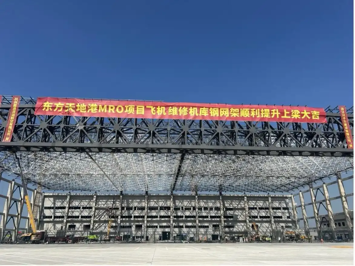 9月15日上午,圆通东方天地港MRO维修机库项目顺利完成钢结构网架屋盖封顶。随着最后一根钢梁精准吊装就位,标志着这一长三角航空维修领域的重大工程进入全面施工冲刺阶段。 此次封顶的网架屋盖面积约14600平方米,采用钢网架与钢桁架组合结构,最大跨度超过151米,总重约3600吨。系统结构复杂、构件类型多样,对焊接工艺与拼装精度要求极高。从当天凌晨起,24台液压提升机协同作业,历经7小时连续提升,最终屋盖抵达预定高度,为项目后续建设奠定坚实基础。 MRO(Maintenance维护, Repair修理, Overhau