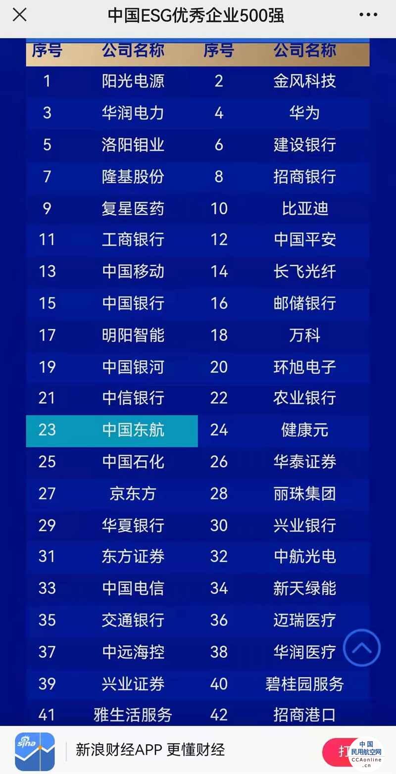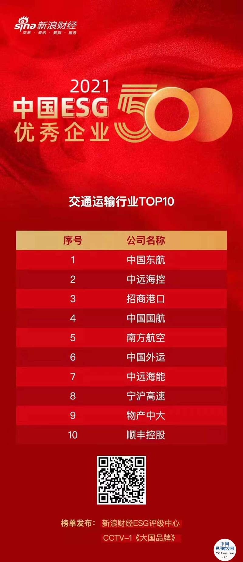 近日,新浪财经ESG评级中心联合CCTV-1《大国品牌》发布首份“2021中国ESG优秀企业500强”名单。中国东航位列榜单第23位,在上榜的交通运输行业中名列首位。这是中国东航继MSCI(明晟)ESG连续第二年评级为A级,中国东航集团被授予中国首批“ESG示范企业”之后,再次获得利益相关方对中国东航ESG履责表现和可持续发展竞争力的认可。