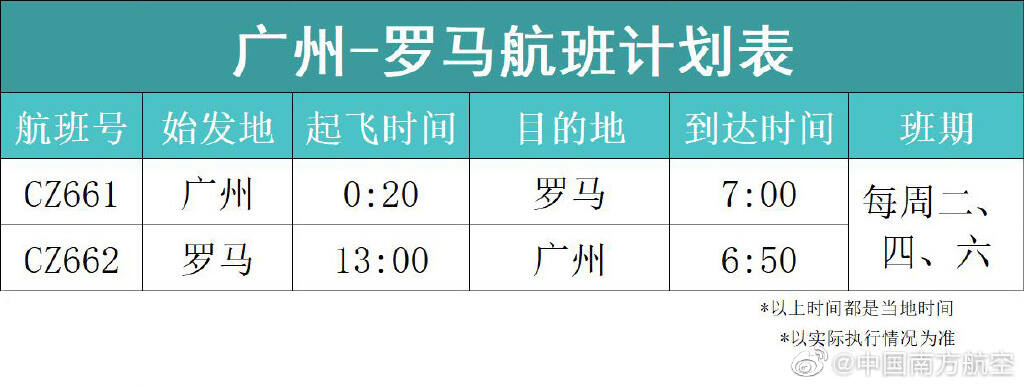 南航将复航广州-罗马国际航线 航空运输要闻 航线航班 23年5月26日 编辑 通讯员mk 取消关注 关注 私信 中国南方航空公司25日宣布,6月17日起,南航将恢复广州至罗马国际航线,每周二、周四、周六执行3个往返。具体时刻为:去程北京时间00:20从广州白云国际机场出发,当地时间15:45到达意大利罗马菲乌米奇诺机场;回程当地时间13:00从意大利罗马菲乌米奇诺机场出发,北京时间次日06:50到达广州白云国际机场。当天落地广州的旅客可有效衔接南航飞往上海、杭州、成都等国内55个城市的航班。 南方航空国际航线航班
