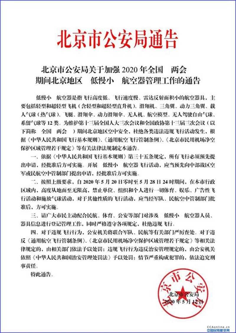 警方通报称,为确保全国“两会”安全顺利进行,按照上级要求,自2020年5月20日零时至5月28日24时期间,在本市行政区域内,高度从地面至无限高,划设临时空中限制区,禁止单位、组织和个人进行一切体育、娱乐、广告性飞行活动和施放气球活动。对于其他性质的飞行活动,应当经军队、民航空中管制部门批准后,方可实施。