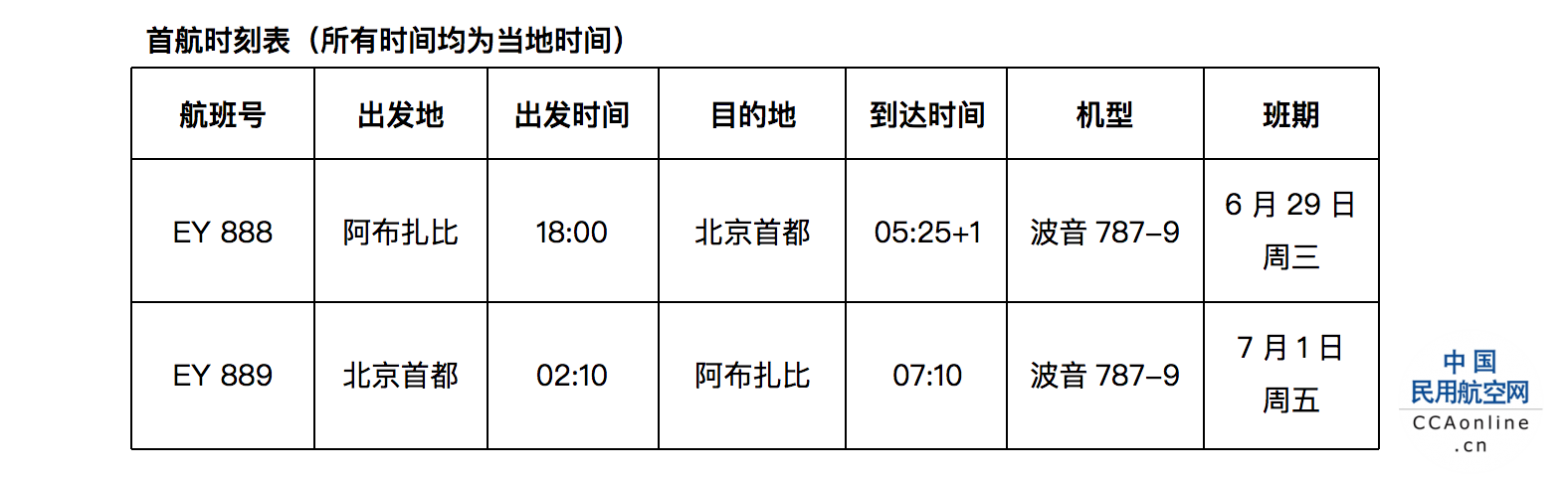 阿联酋国家航空公司阿提哈德航空宣布将于2022年6月29日起恢复阿联酋首都阿布扎比至中国首都北京的直飞客运航线,该航线是近期国务院应对新冠疫情联防联控机制对入境北京直飞国际客运航班调整以来开通的首条定期直飞航线。