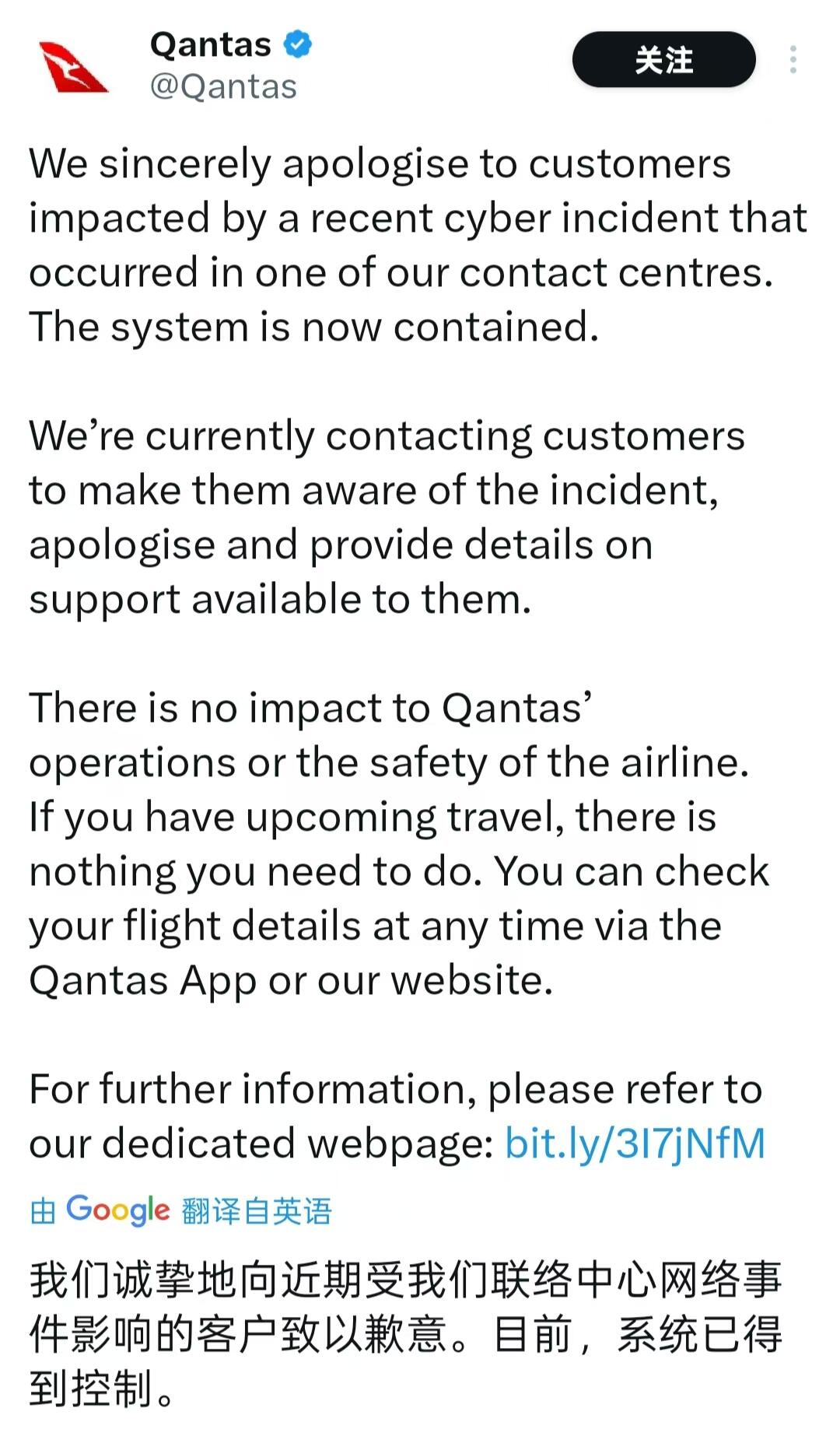 澳洲航空遭网络攻击 600万客户信息恐泄露 航空安全要闻 25年7月2日 编辑 通讯员mk 取消关注 关注 私信 7月2日,澳洲航空公司发表声明称,其一家联络中心发生网络安全事件,大量用户数据被盗。该联络中心使用的第三方平台存有约600万名客户的服务记录。 当地时间6月30日,该第三方平台检测到异常活动,目前系统已被隔离。澳航正在调查犯罪分子入侵方式及被盗数据比例,预计数量较大。 被盗数据包括部分客户的姓名、电子邮件地址等,但系统中不保存信用卡详情、个人财务信息和护照详情。此次事件未对澳航运营或航空安全造成影响,所有系统均保持安全。 澳洲航空数据泄露