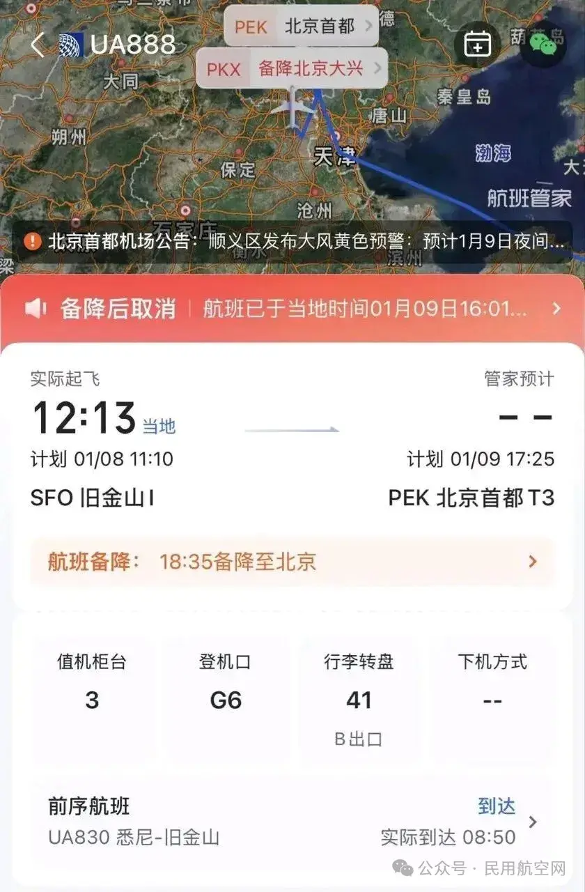 据飞常准及航班管家数据显示,该航班于旧金山当地时间1月8日12:14起飞,执飞机型为波音B777-224宽体机,原计划北京时间1月9日17:25抵达北京首都机场。当日下午,航班接近首都机场准备降落时,机身已下降至100多米高度,却因突发天气状况突然拉升复飞,随后在空域绕圈调整后,于18:36备降至北京大兴国际机场。
