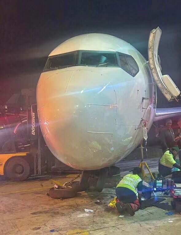 初步调查显示,飞机因机头千斤顶突然移位而失去平衡,向前倾斜。飞机机身前部遭受了严重的结构损坏,事故中受伤的技术人员仍在附近的医院继续接受治疗。