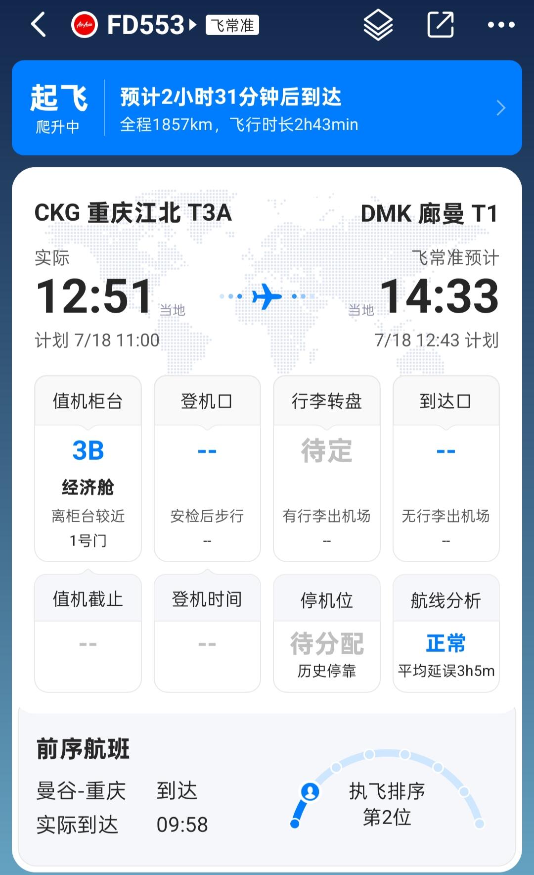 涉事航班抵达重庆江北机场后,后续由重庆飞往曼谷的FD553次航班执飞,根据飞行平台信息显示,该航班已于18日12点52分起飞飞往廊曼。
