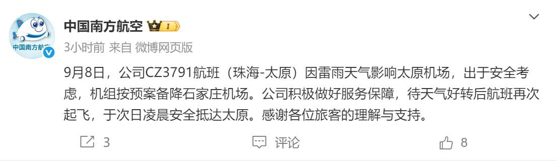 CZ3791航班遭遇雷暴剧烈颠簸?南航最新通报 航空安全头条 9月9日 编辑 通讯员mk 取消关注 关注 私信 9月8日,珠海飞往太原的CZ3791航班遭遇强气流,飞机强烈颠簸引发乘客尖叫。有机上乘客称自己当时十分紧张,“飞机颠簸厉害像坐过山车一样,客舱里的乘客不断叫唤,整个过程持续十余分钟。” 航班管家APP显示,CZ3791次航班于9月8日18时50分从珠海金湾机场起飞,21时53分备降石家庄,次日0时36分再次起飞,1时12分成功降落太原,晚点5小时42分。 9月9日下午,南方航空发布情况说明: 热点:空中颠簸南方航空