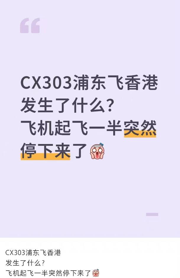 CX303紧急中断起飞 航空安全头条 9小时前 编辑 通讯员mk 取消关注 关注 私信 11月4日上午,多名网友在社交平台称,国泰航空CX303航班在起飞前一刻紧急刹车,随即取消起飞。 网友称,CX303航班在跑道开始加速后不到三秒突然急刹,开减速板,然后取消起飞。旅客在飞机上等待了三个小时,期间有工程师检查飞机情况,直到10点多才接到通知让下飞机。 根据网友发布的通知内容,CX303客机突发机械故障,航班取消。国泰航空安排了酒店供旅客休息。 相关推荐: 印度乘客刺伤两名青少年 汉莎航空一飞机紧急着陆 肯尼亚最新确认:失事飞机上共有11人 全部遇难 打捞团队完成工作离开 香港机场北跑道将重开 俄安-24客机坠毁事件涉事航司商业航班运营许可证被吊销 西部航空旅客充电宝突然冒烟 航司最新回应 国泰航空机械故障