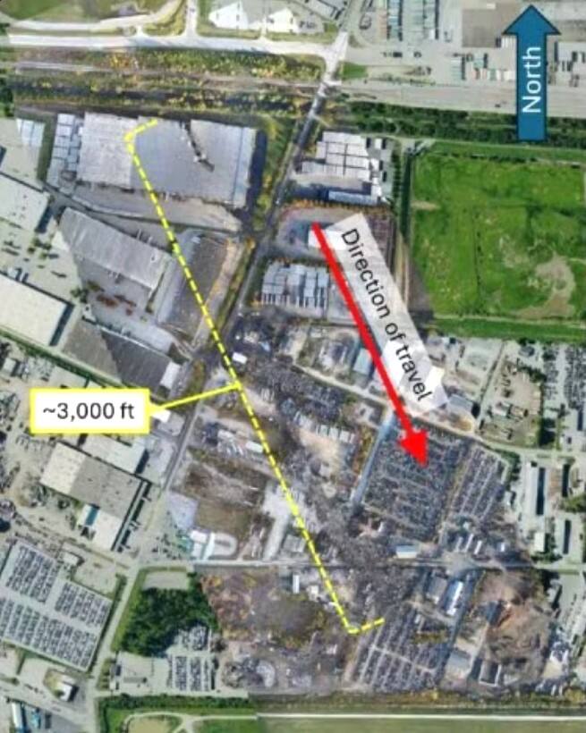 无线电高度数据显示,飞机在飞越17R跑道末端的防爆堤前爬升至约100英尺。然而,主起落架撞上了SDF南端UPS供应链解决方案仓库的屋顶,随后飞机撞上了附近的回收设施。