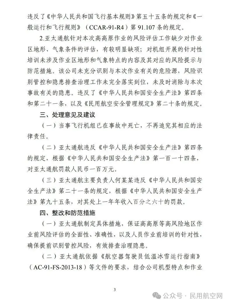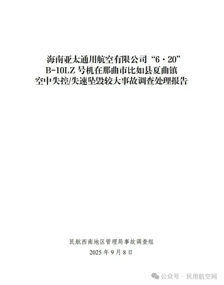 执行科考任务飞机坠毁致3死 调查报告公布 航空安全头条 事故 2月19日 编辑 通讯员mk 取消关注 关注 私信 2月13日,中国民航西南管理局向社会公布《海南亚太通用航空有限公司“6·20”B-10LZ号机在那曲市比如县夏曲镇空中失控/失速坠毁较大事故调查处理报告》。 报告显示,2025年6月20日,亚太通航C90GTi/B-10LZ号机自格尔木机场起飞,飞往西藏那曲地区执行科学实验任务。当日15:10,飞机坠毁,事故造成机上3人死亡。 报告指出,此次事故的直接原因为:机组未操纵飞机避开有威胁的云团,飞机在云中失速,未能及时改出而坠毁。导致飞机失速的最大可能原因为云中严重结冰。 报告全文如下: 相关推荐: 椰风暖宿守初心,青心相伴贺新春——三亚空管站团委开展春节关爱青年活动 筑牢安全防线,彰显先锋本色——技术保障部开展党员承诺书签订活动 阿里克航空一客机发动机部分脱落紧急备降 索马里一客机冲入海中 未造成人员受伤 航空器事故调查调查报告