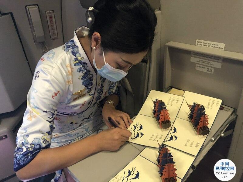 乘务员在明信片上为退伍军人写寄语