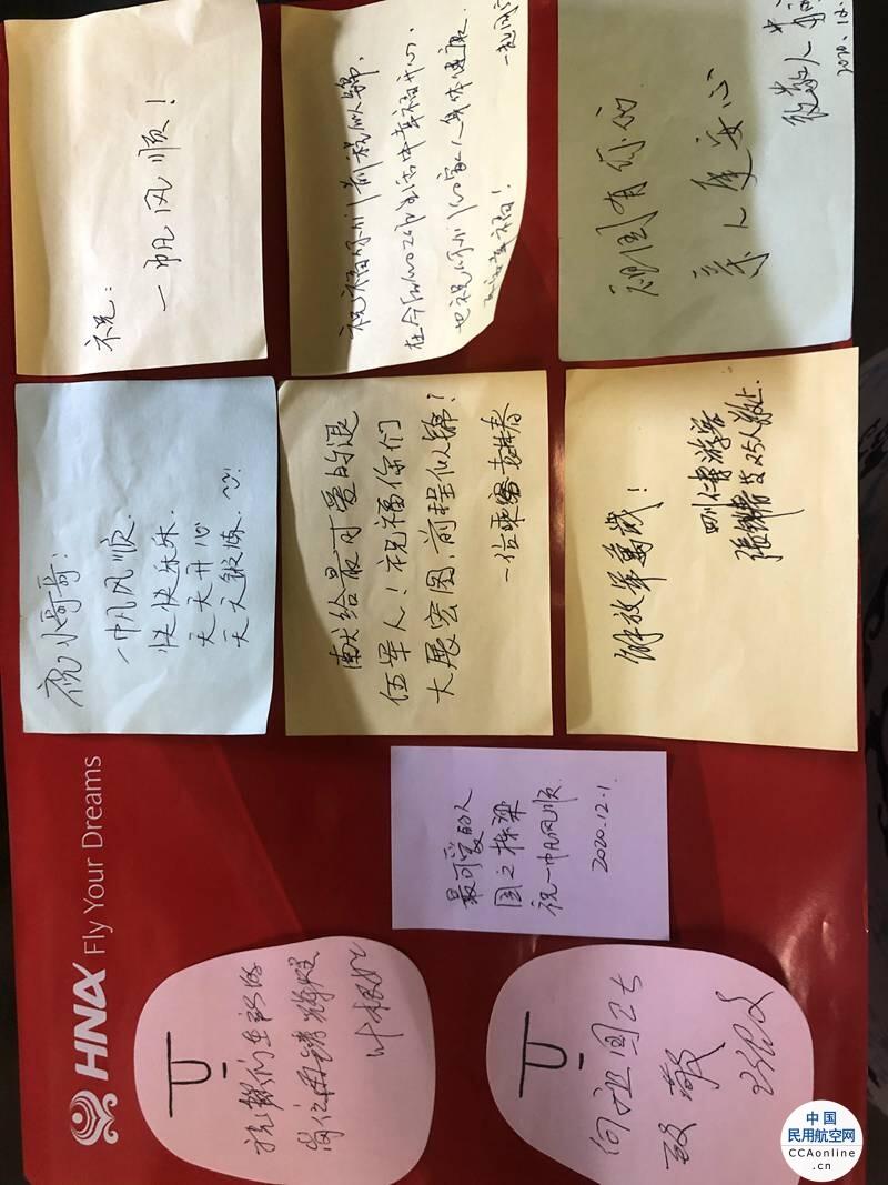 看着四位军人,乘务员们心生敬佩,想尽自己的心意在冬日里温暖战士们回家的路。于是,乘务员提起笔在明信片上用最简单的语言抒发敬佩之情,让战士们感受到来自海南航空乘务组的一份心意。同时,在工作的空闲之余准备了小小的惊喜,并动员旅客一起为他们写上衷心的祝福:“献给最可爱的退伍军人,祝你们大展宏图,前程似锦!”“祖国有你们,亲人更安心。”还有来自家乡四川的25名游客共同留言:“解放军万岁!”……一张张五颜六色的便利贴承载着旅客们的祝福,传递着大家心中对军人满满的爱。