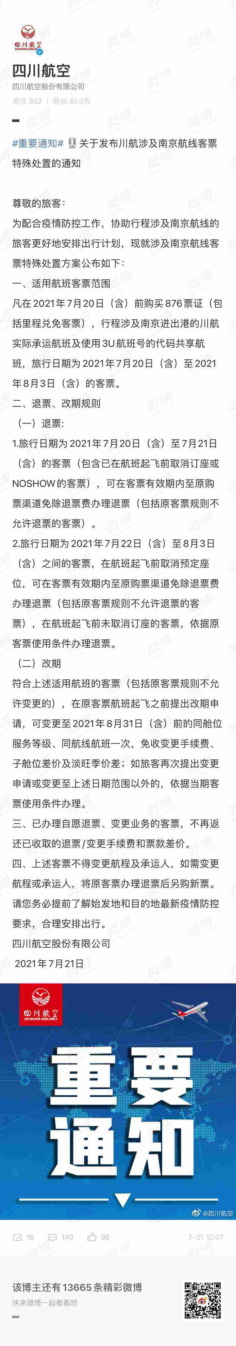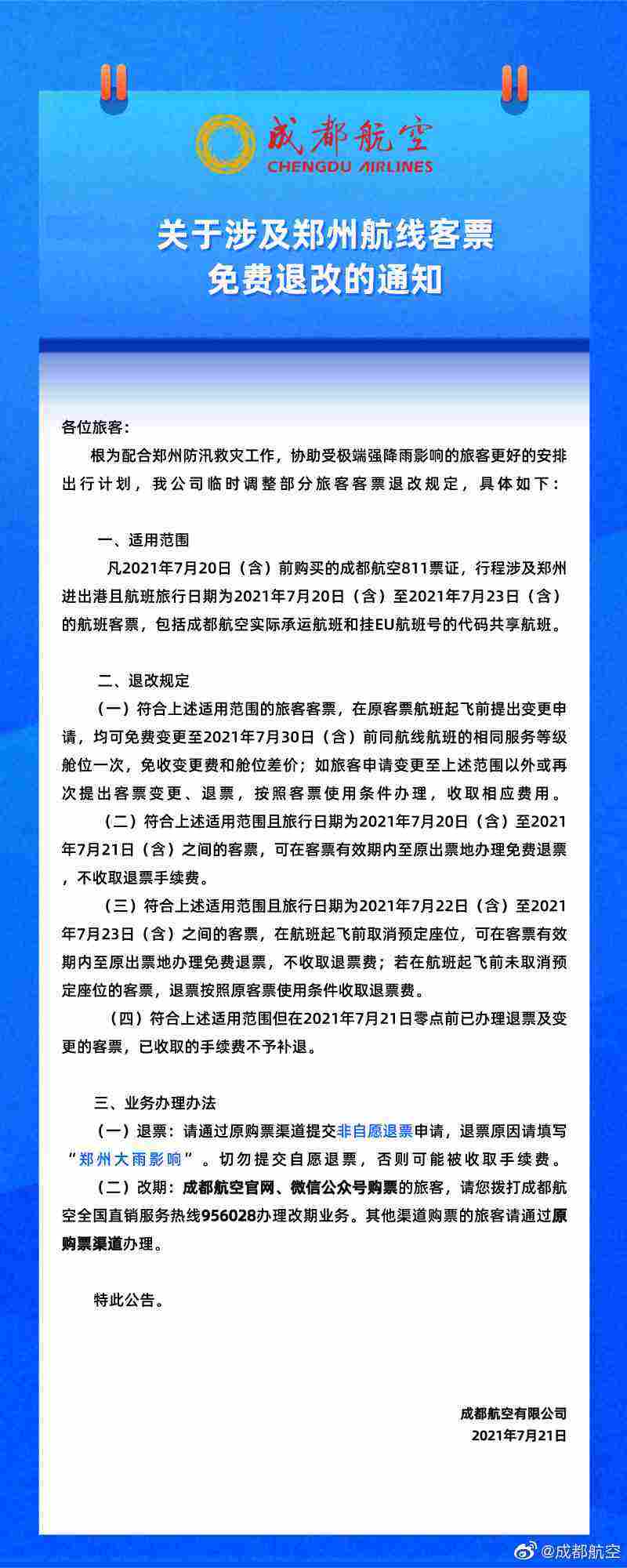 四川航空、成都航空:涉及郑州、南京航线客票可特殊处置 服务保障要闻 旅客服务 服务保障 21年7月22日 编辑 hz 取消关注 关注 私信 红星新闻记者今(21)日从四川航空获悉,为配合疫情防控工作,协助行程涉及南京航线的旅客更好地安排出行计划,四川航空已发布涉及南京航线客票特殊处置方案。 此外,为配合郑州防汛救灾工作,成都航空也临时调整部分旅客客票退改规定,发布了关于涉及郑州航线客票免费退改的通知。 据记者统计,截至目前国内已有多家航空公司宣布对涉及郑州、南京的航线客票进行含免费退改在内的特殊处置,包括东方航空、西部航空、幸福航空、深圳航空、祥鹏航空、海南航空、吉祥航空、四川航空、成都航空等。 四川航空成都航空