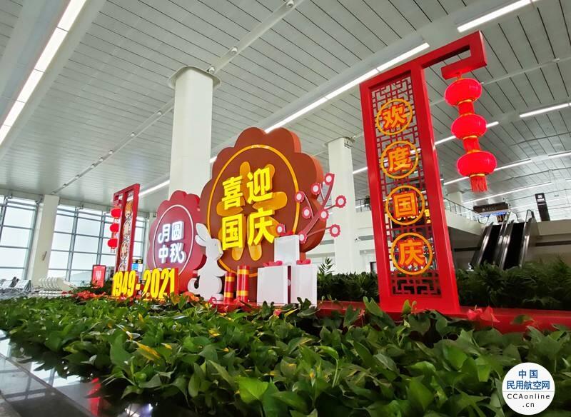 加强国庆氛围营造。在机场北坪路、迎宾路等路段灯杆上增加了146面国旗,在航站楼隔离区内悬挂了一面5*3.3米五星红旗;出港大厅远机位扶梯口新增以国庆为主题的主题景观和绿植景观;航站楼出港大厅及候机区、停车场等区域大型LED屏增加国庆画面,营造了浓厚节日气氛。