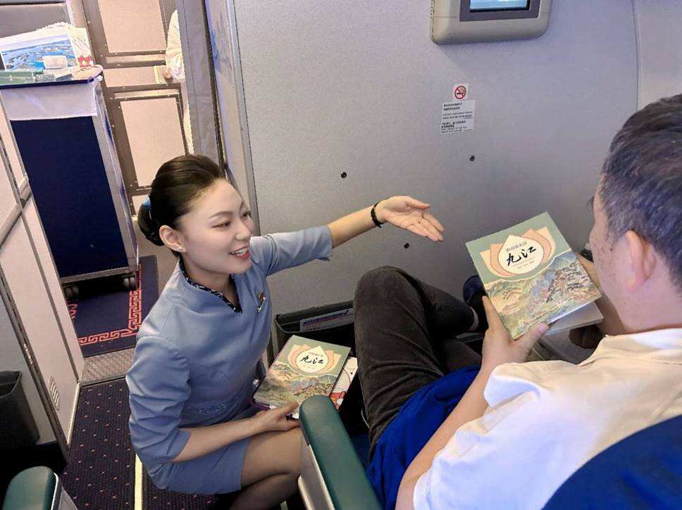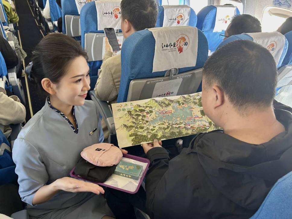 在4月26、27日南昌-北京的往返航班上,江西航空为旅客们送上精心准备的《跟着课本游九江》城市读本,乘务员们则化身“文化讲解员”,为旅客导读这本包含九江历史文化、自然风光和特色美食的读本。书中特别推荐了景色秀美的庐山、浩渺无垠的鄱阳湖以及九江市内充满历史底蕴的名胜古迹,让旅客们在万米云端感受到九江的独特魅力。