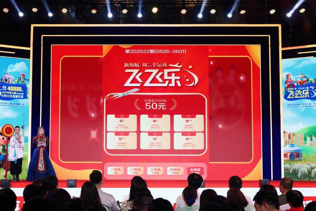 新海航“飞飞乐”周二幸运夜现金抽奖活动是海航航空集团与消费者共享企业发展成果、助力航空旅游经济发展新路径的创新性重点项目,每周二开展一场直播抽奖并通过海南航空APP进行直播。活动期间,旅客凭中国大陆有效身份证件实际乘坐海航航空集团旗下11家指定航司任一航班,即可自动获得下一个自然周周二现金抽奖的参与资格。11家指定航司包括海南航空、首都航空、天津航空、祥鹏航空、西部航空、北部湾航空、福州航空、乌鲁木齐航空、长安航空、金鹏航空和大新华航空。活动每期抽奖设置现金奖项名额3173个,其中一等奖3个,奖金金额为48888元,其余奖项奖金金额分别为5000元、1000元、200元和50元。中奖旅客自中奖公布次日起30个日历天内,还可享受海航航空集团旗下境内航司自营国内指定航班经济舱全票价3折购票礼遇。