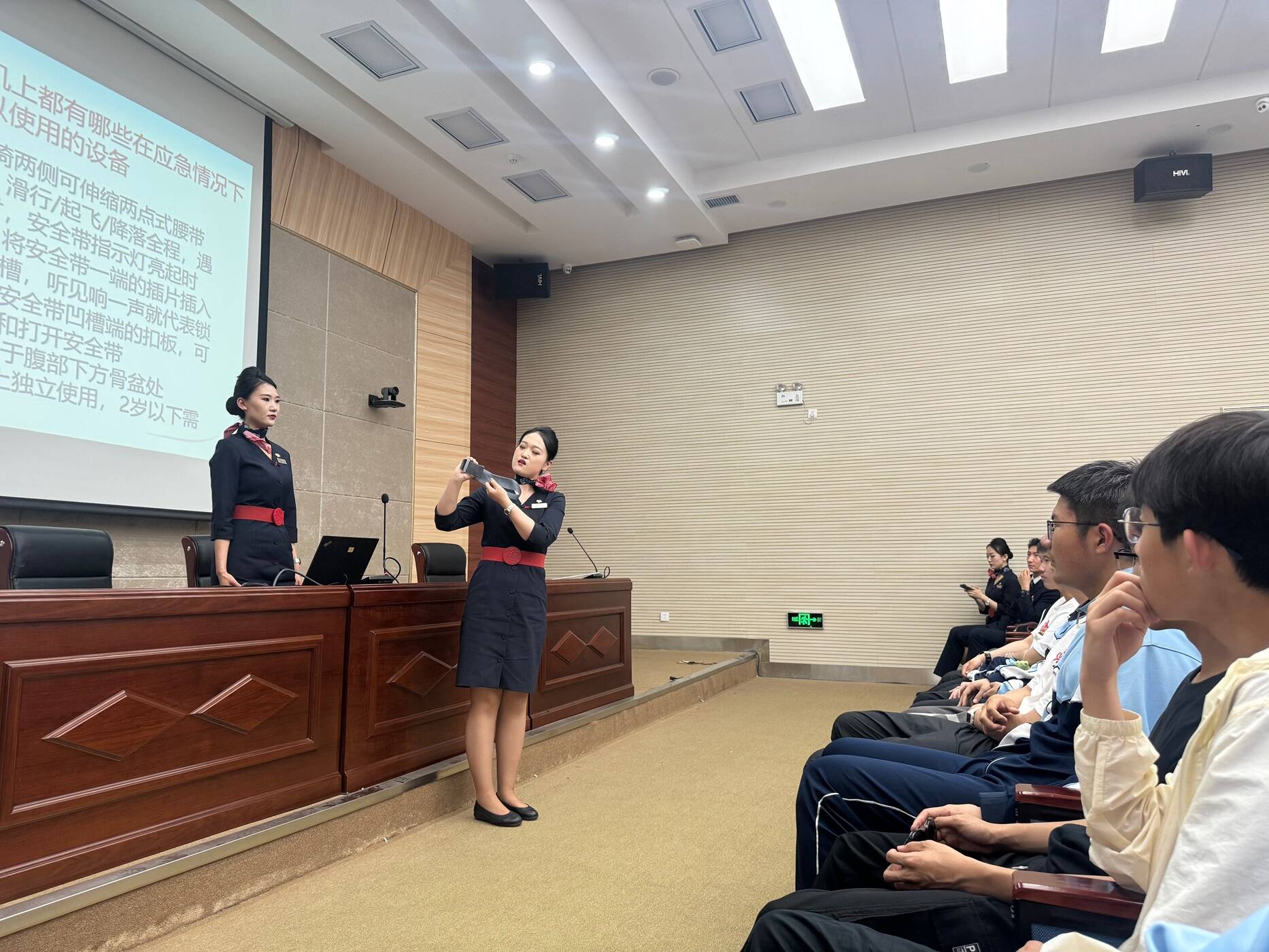 当乘务组展示A320客舱应急设备时,防护式呼吸装置展开的瞬间,引得同学们不约而同发出惊叹。尤其令人惊喜的是,一位化学课代表敏锐地提出:“Halon(海伦)灭火器是利用化学链式反应抑制和物理窒息双重机制原理吗?”这一专业问题瞬间将现场氛围推向高潮,教室俨然变成了热烈的民航知识研讨会。