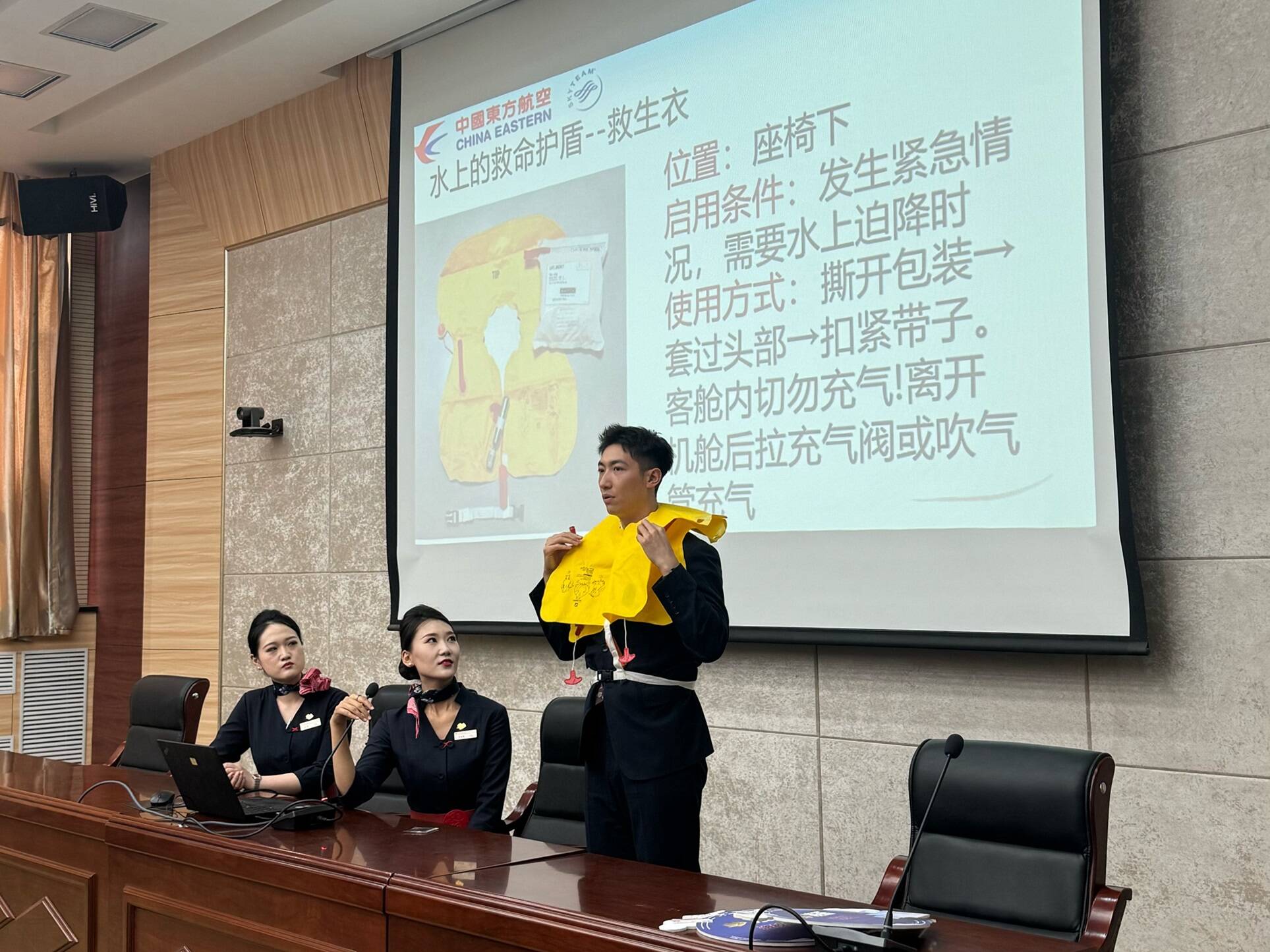 通讯员(邱龙辉、安瑞东)报道 5月29日下午,兰州市兰大附中的教室里传来阵阵赞叹声,东航甘肃分公司“凌燕”乘务示范组带着飞机模型和客舱应急设备教学模型走进校园,为高一学生带来了一场别开生面的民航知识科普课。
