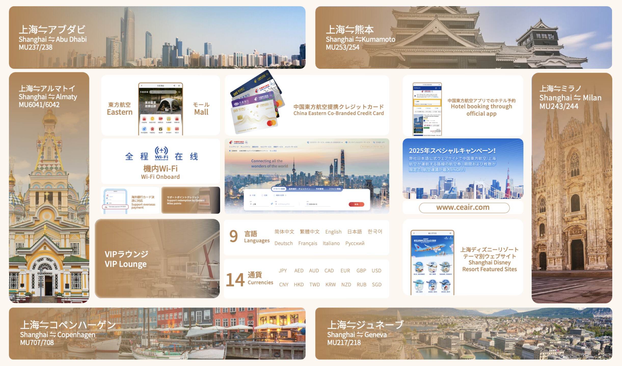 为便利国内旅客前往大阪世博会,东航APP、小程序推出了“乘东航 去世博 看世界”专区,为旅客梳理国内飞大阪航线信息和购票优惠,整合酒店、空中Wi-Fi、签证、接送机等出行产品,便利旅客一站式购买。到达日本后,旅客持东航或上航登机牌还可享合作商户购物礼遇,持东航联名信用卡消费返积分。