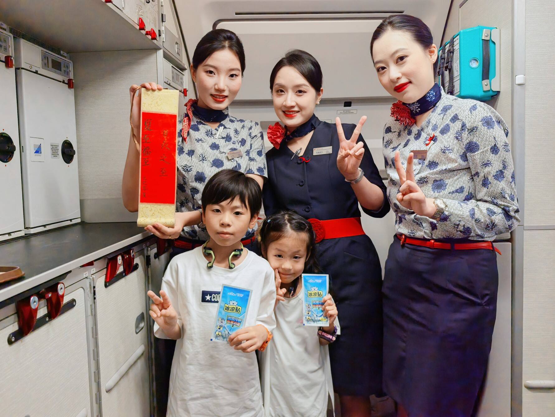 随着暑运的开启,客舱中迎来了58位放暑假的小旅客(不满12周岁)以及家长朋友们,客舱中满是欢乐氛围。乘务组还与小朋友们开展了传统文化问答抽盲盒的互动。