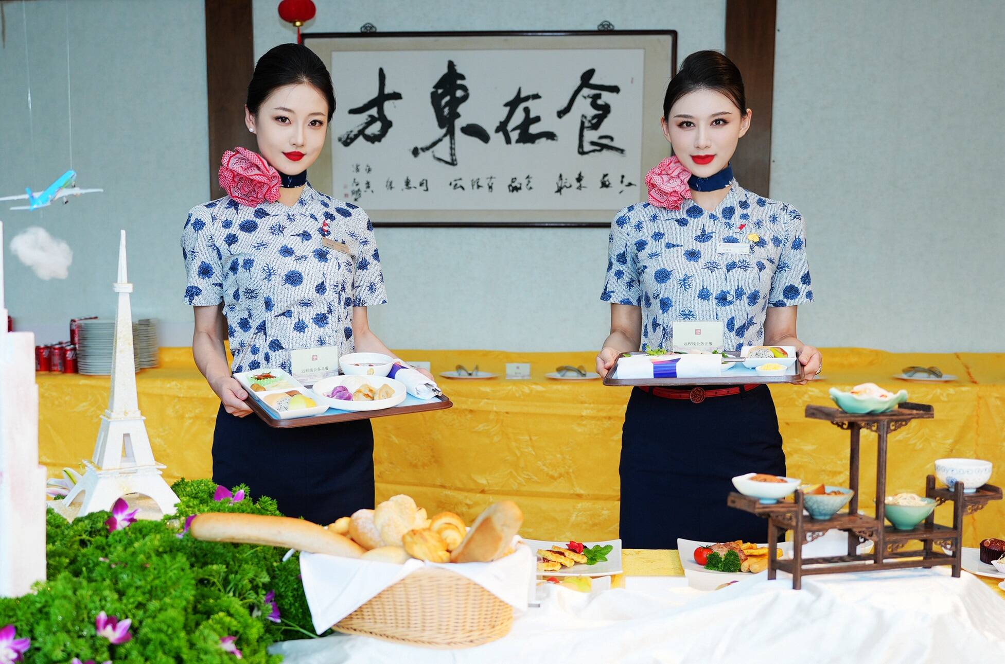 在江苏航食中餐试餐间,首先映入眼帘的是空厨们精心制作的南京紫峰大厦和巴黎艾菲尔铁塔的模型,一架东航彩绘777-300飞机,将中法两个著名城市的标志性建筑连接在一起,象征着今年7月9日MU845/6南京-巴黎这条中国东航全新远程洲际客运航线的盛大开航。
