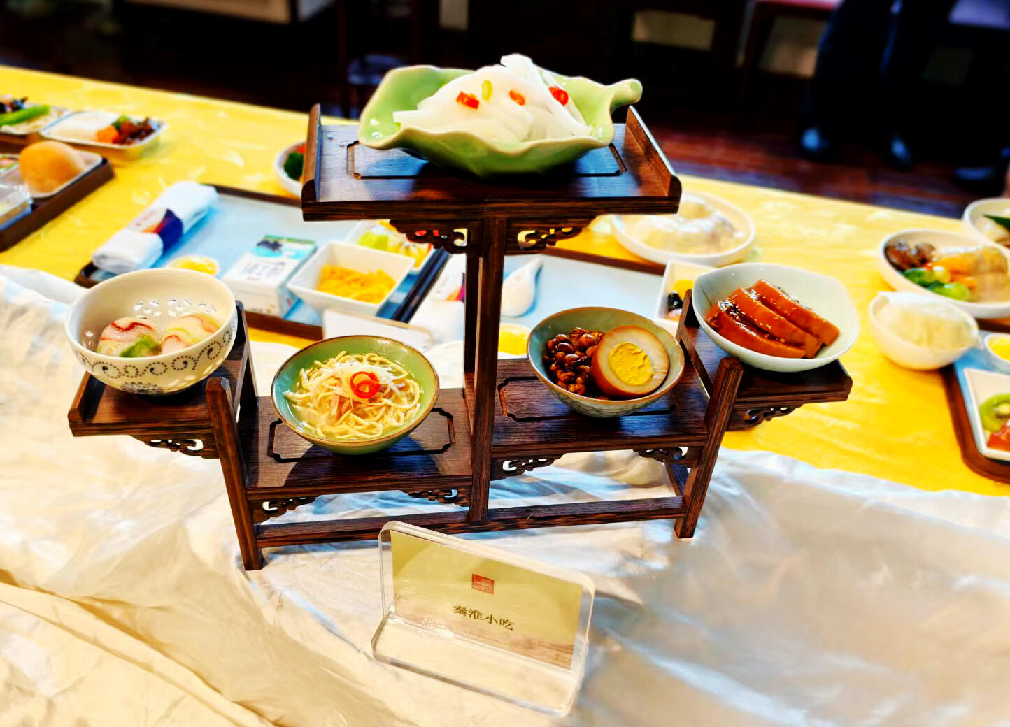 在暑运特色餐食展区,东航江苏在公务舱和经济舱推出了极具地方特色的菜肴、小吃和消暑清凉甜品,如在公务舱推出了江南地方特色的菜肴美龄牛肉、无锡酱排骨、清炖狮子头,还有秦淮特色小吃,如卤蛋状元豆、鸡汁干丝、桂花莲藕、雨花石汤团、金陵拌凉粉等;消暑甜品有绿豆爽、银耳羹等。据现场介绍,后续,东航江苏还将结合旅客需求和季节特点,陆续推出冰粉、杨枝甘露等。
