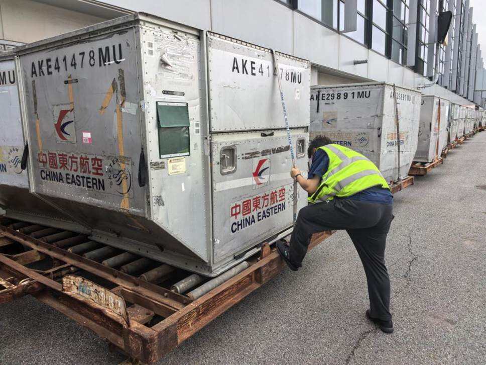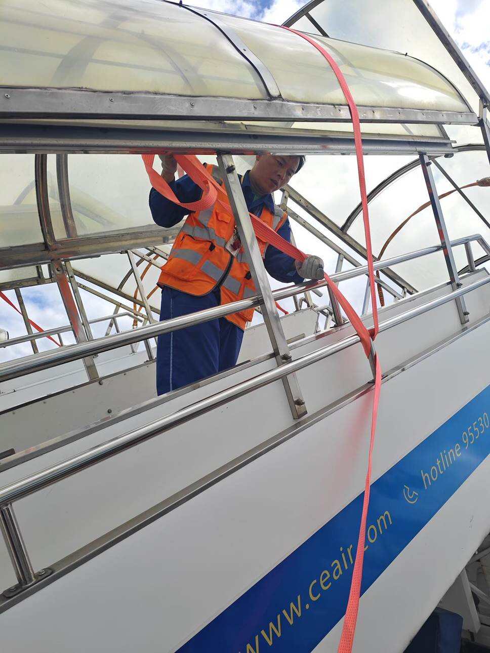 台风来临前夕,东航集中组织机坪地面设备系留工作,图为东航工作人员捆扎行李集装箱、加固客梯车防水雨棚。