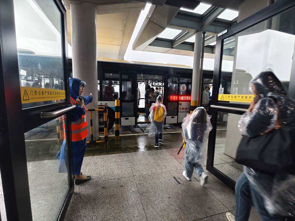 在上海浦东国际机场,东航为远机位登机旅客准备了雨披。在摆渡车、客梯车等点位,安排工作人员值守,及时为旅客提供帮助。