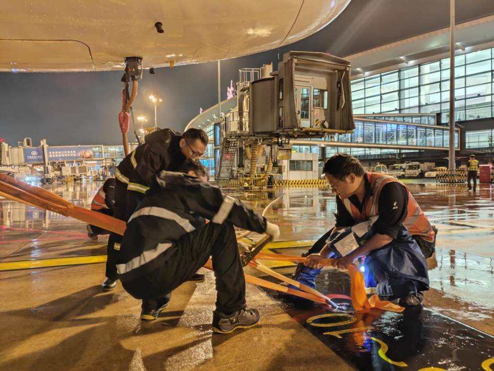 7月29日晚,东航机务工程师在雨中对夜间停靠宁波栎社机场的飞机进行加固系留