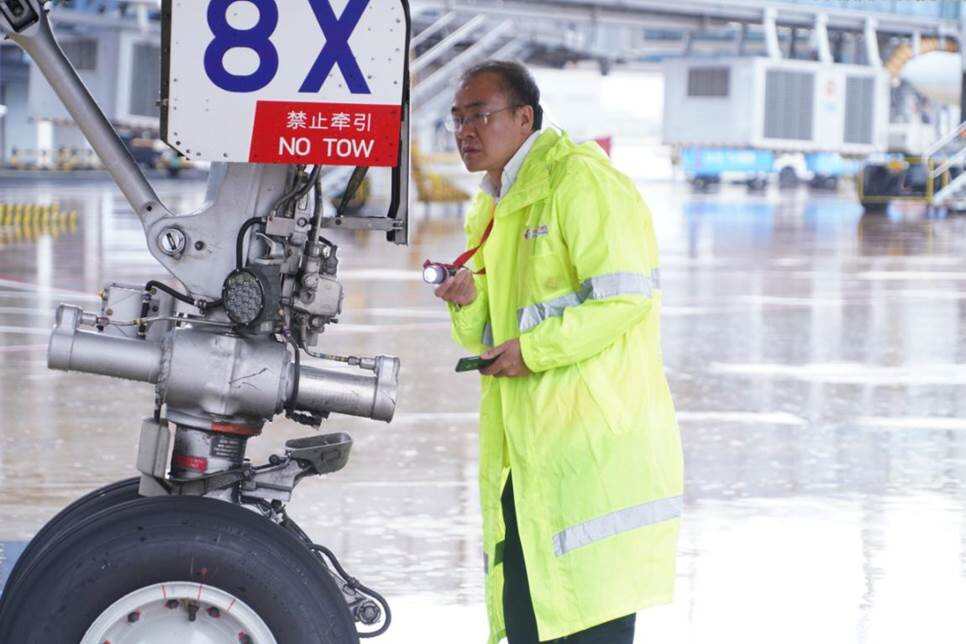 在宁波栎社国际机场,东航机务工程师在雨中对飞机执行航后检查