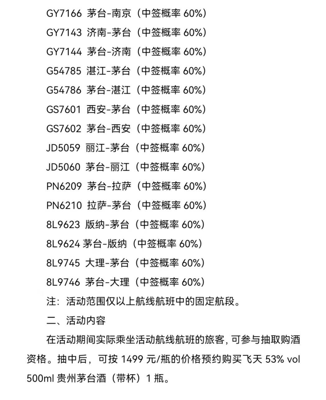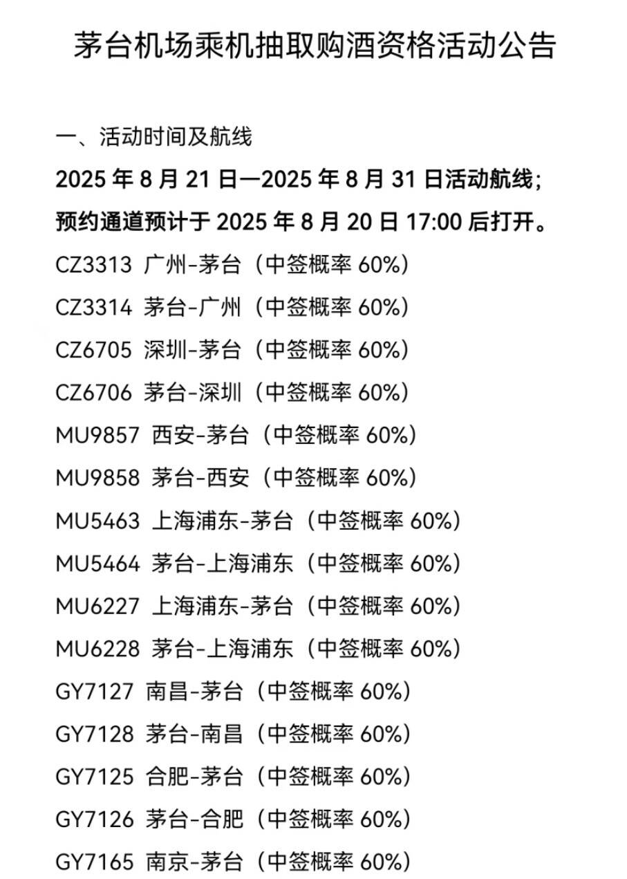 茅台机场推出新一轮乘机抽飞天活动 服务保障要闻 旅客服务 25年8月20日 编辑 通讯员mk 取消关注 关注 私信 8月19日,遵义茅台机场官方微信号发布消息,将于8月21日开启新一轮乘机抽取购酒资格活动。在8月21日至8月31日活动期间,实际乘坐活动航线航班的旅客,可参与抽取购酒资格。公告显示,预约通道预计于8月20日17:00 后开通,此次活动中签率设定为 60%。 活动公告显示,茅台机场有30条航线参与了8月20日至8月31日期间的活动。活动期间实际乘坐活动航线航班的旅客,可参与抽取购酒资格。抽中后,可按1499元/瓶的价格预约购买飞天53%vol500ml 贵州茅台酒(带杯)1瓶。 遵义茅台机场