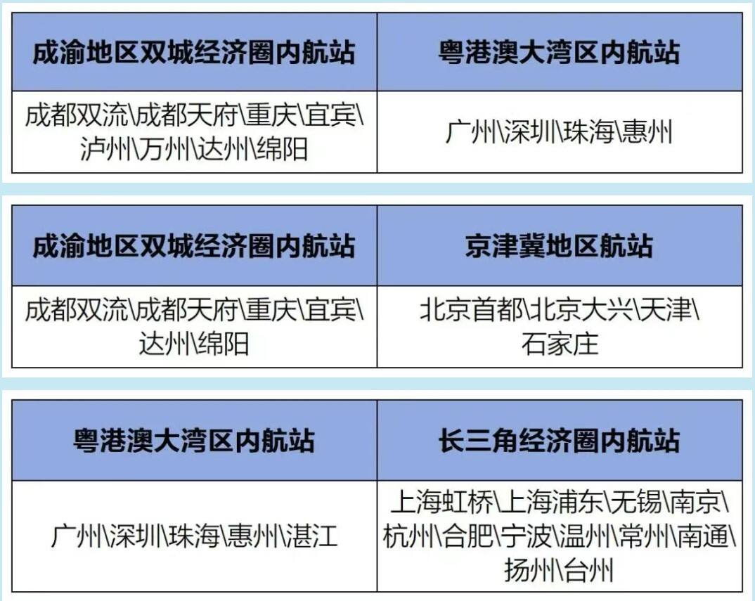 区域内航站往返航线,具体航线组成由下表左右两个任选一个组合: