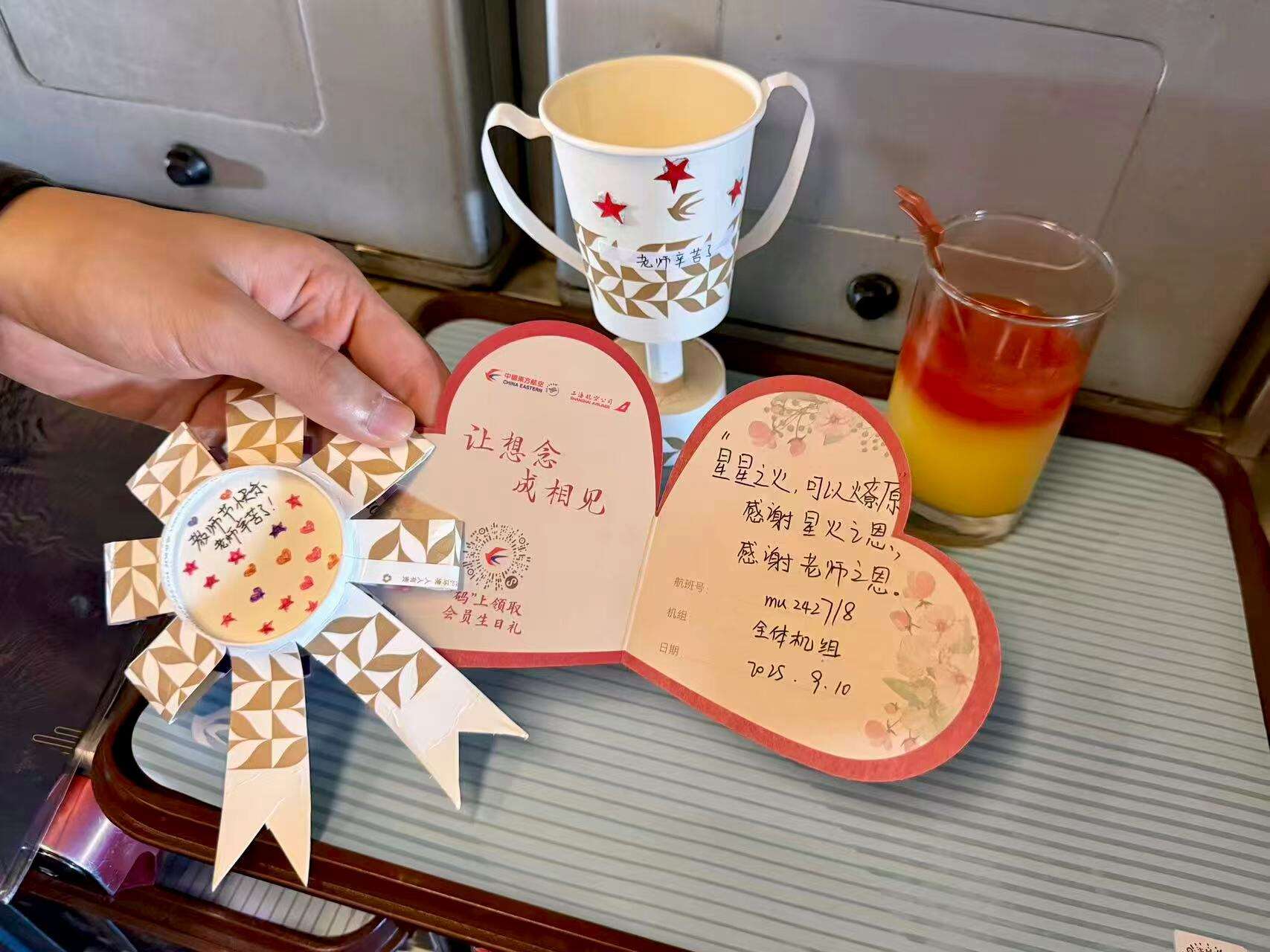 航班飞行期间,乘务组寻找当天乘坐航班的教师旅客,将这份饱含敬意的礼物逐一送到他们手中,并当面表达对教师的深深敬意。除节日礼物外,乘务组还为教师旅客特别调制了东航特色饮品,搭配手写的暖心卡片,让惊喜与温暖在万米高空传递。这份突如其来的礼遇,不仅让教师旅客们深切感受到了节日的浓厚氛围,更让此次飞行旅程成为了一段难忘的教师节记忆。