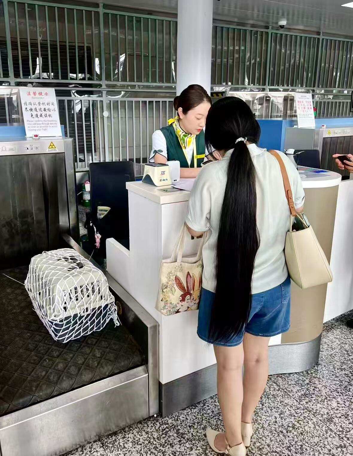 当天,杨女士提前抵达石家庄正定国际机场,为爱猫办理值机手续。根据中国民用航空局及春秋航空的宠物运输规定,杨女士提前准备了猫咪的《动物检疫合格证明》、疫苗接种证明等相关文件,并使用了符合标准的硬质航空箱。春秋航空地面服务人员核对材料后,对航空箱的通风性、牢固性和尺寸、重量进行了全面检查,确保其符合飞行安全要求。随后,工作人员为猫咪办理了值机手续,并贴心提醒杨女士在登机前让宠物适当饮水、保持放松。登机后,猫咪被妥善安置在“宠物友好三联座位区”,杨女士落座过道位,航空箱固定于中间及靠窗的两个座位,通过物理隔断为猫咪和主人营造出一个相对独立且安全的监护空间。飞行过程中,乘务人员多次贴心询问宠物状况,并提醒杨女士可在飞行平稳阶段适当给猫咪补充水分。航班抵达上海虹桥机场后,杨女士带着爱猫轻松下机。经过两个小时的飞行,猫咪状态良好,好奇地打量着这个新的城市。“以后再也不用担心出差时把它独自留在家了。”杨女士开心地说。