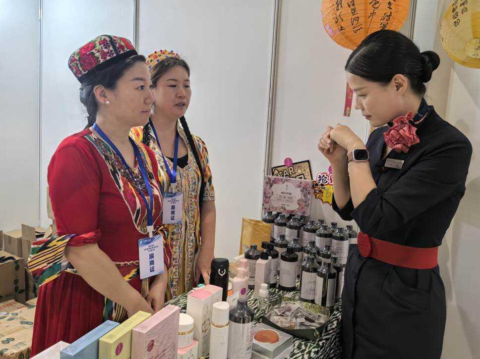 另一侧,来自新疆的展台上,身着维吾尔族服饰的展销商正给东航员工试用玫瑰精油:“我们的玫瑰种在沙漠里,后面就是昆仑山,6800亩基地带动了当地老百姓种植技术的提升。”