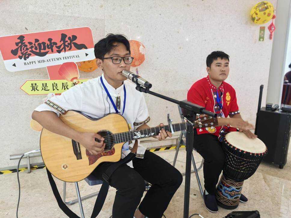 集市一角,99年出生的傣族小伙刀发龙正抱着吉他弹唱家乡的歌《祝福送给你》,淳朴的歌声里唱出了对东航员工帮扶的感谢和祝福。