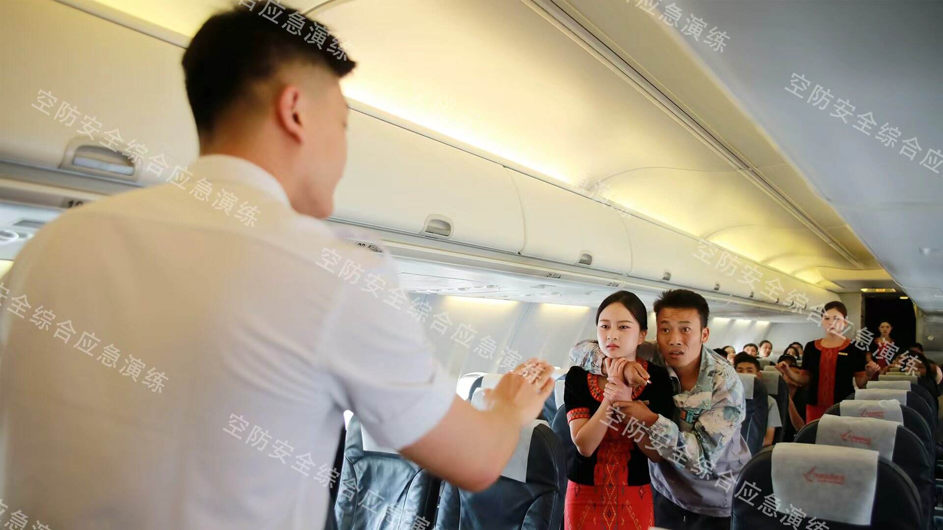 演练模拟一架波音737-800客机在执行航班任务时,发生旅客因座椅问题争执,继而升级为非法干扰事件。机组高效联动,迅速启动应急程序,安全员果断介入对峙谈判稳定现场局势,乘务员组织客舱控制,飞行员第一时间向苏南瑞丽航空AOC指挥中心报告并决策返航昆明,为地面处置争取关键时间,打造“空地一体”处置前端。