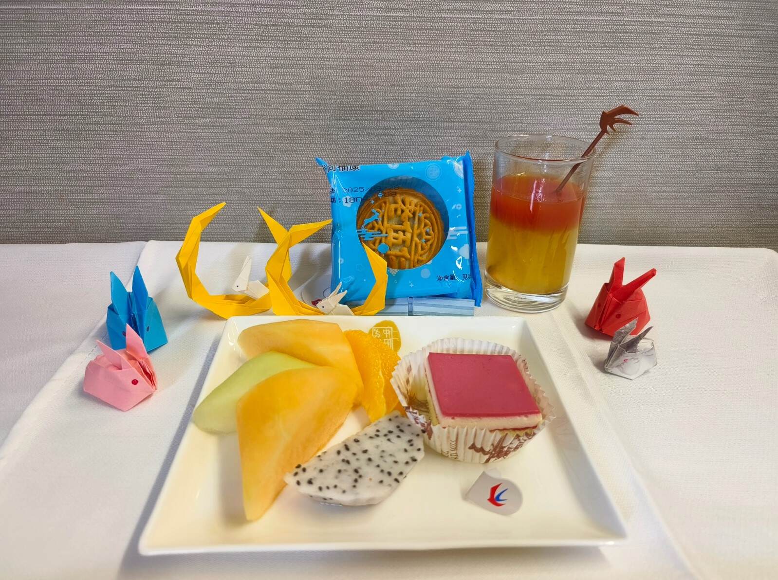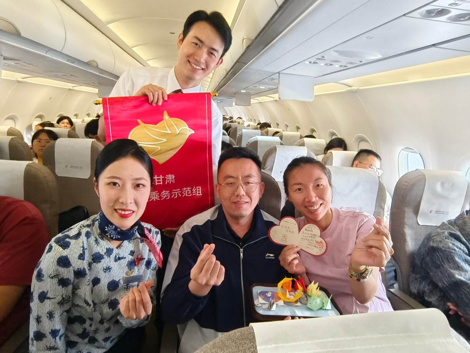 当航班进入平飞阶段,客舱内开始了温馨的中秋庆祝活动。乘务组为旅客们送上了精心准备的手工折纸、心意卡片和特色饮品“东航那杯茶”。这些别出心裁的节日礼物,以其独特的心意赢得了旅客们的喜爱。