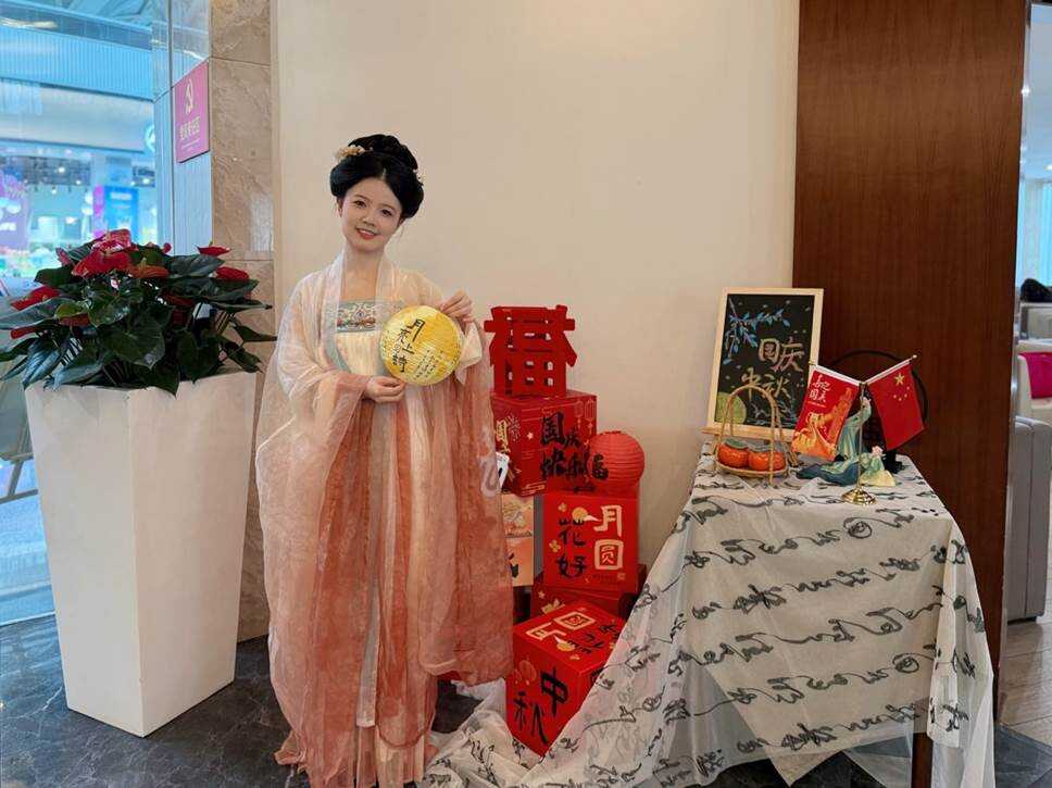 在候机楼内,航天府与双流两地贵宾室联动推出“云端华诞,尊享礼遇”及“家国共团圆 月满颂华诞”系列主题活动。“跳动的中国心”按钮打卡、国潮花灯DIY、金箔团扇绘制及非遗青花瓷“嫦娥奔月”创作等传统文化体验,川味藤椒牛肉月饼等节日美食,为旅客打造了一段难忘的双节出行记忆,让匆匆旅途充满愉悦与仪式感。