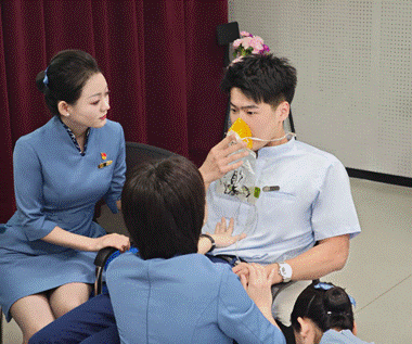 “旅客突发焦虑、意识模糊!”“有旅客腹痛难忍,请求帮助!”在情景模拟演练中,两场高度还原的机上紧急事件相继上演。面对“抑郁症旅客突发焦虑”和“急腹症旅客”等场景,乘务组分工明确、反应迅速:广播寻医、安抚旅客、准备急救设备、维护客舱秩序,一系列操作行云流水。尤其是在处置急腹症时,乘务员协助旅客调整至侧卧屈膝体位缓解疼痛,并严守“不随意用药”原则,专业细致的应对赢得现场一致认可。