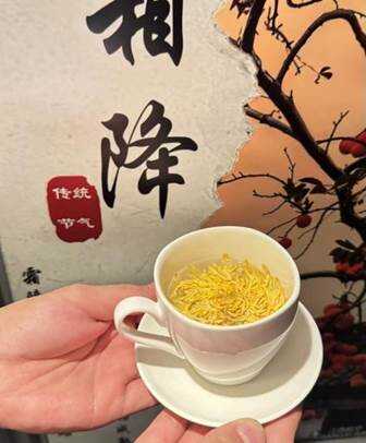 活动接近尾声,乘务员为每位旅客递上了霜降专属菊花茶。“霜降要到了,喝杯菊花茶能清热降火。”一句句贴心的提醒,配上手里温热的茶水,暖意顺着茶杯传递到了旅客们的指尖。“霜降是秋天的收尾,也是冬天的开头。希望这杯茶、这场活动,能让大家记住这个节气的特别。江西航空祝您霜降安康,万事顺意!”随着乘务长的广播声,此次活动圆满落下了帷幕。