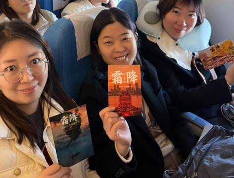 活动伊始,乘务长通过客舱广播送上霜降问候,随后“霜降节气知识有奖竞答”热闹开启。“‘停车坐爱枫林晚,霜叶红于二月花’的作者是谁?”广播声刚落,机舱内便响起此起彼伏的作答声,一位旅客迅速抢答“杜牧”,成功收获秋叶标本书签;当问到“霜降后气温降至多少度以下会凝结成霜”时,后排旅客一声响亮的“0度左右”成功答对问题并收获了一份“知识奖励”。