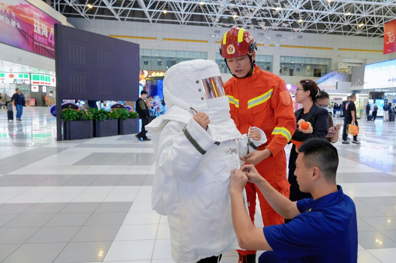 在消防救援器材展示区,破拆工具组、正压式空气呼吸器等专业救援装备整齐陈列,专职消防救援员现场讲解装备功能与实战应用场景,让参与者直观感受机场坚实的消防保障实力。