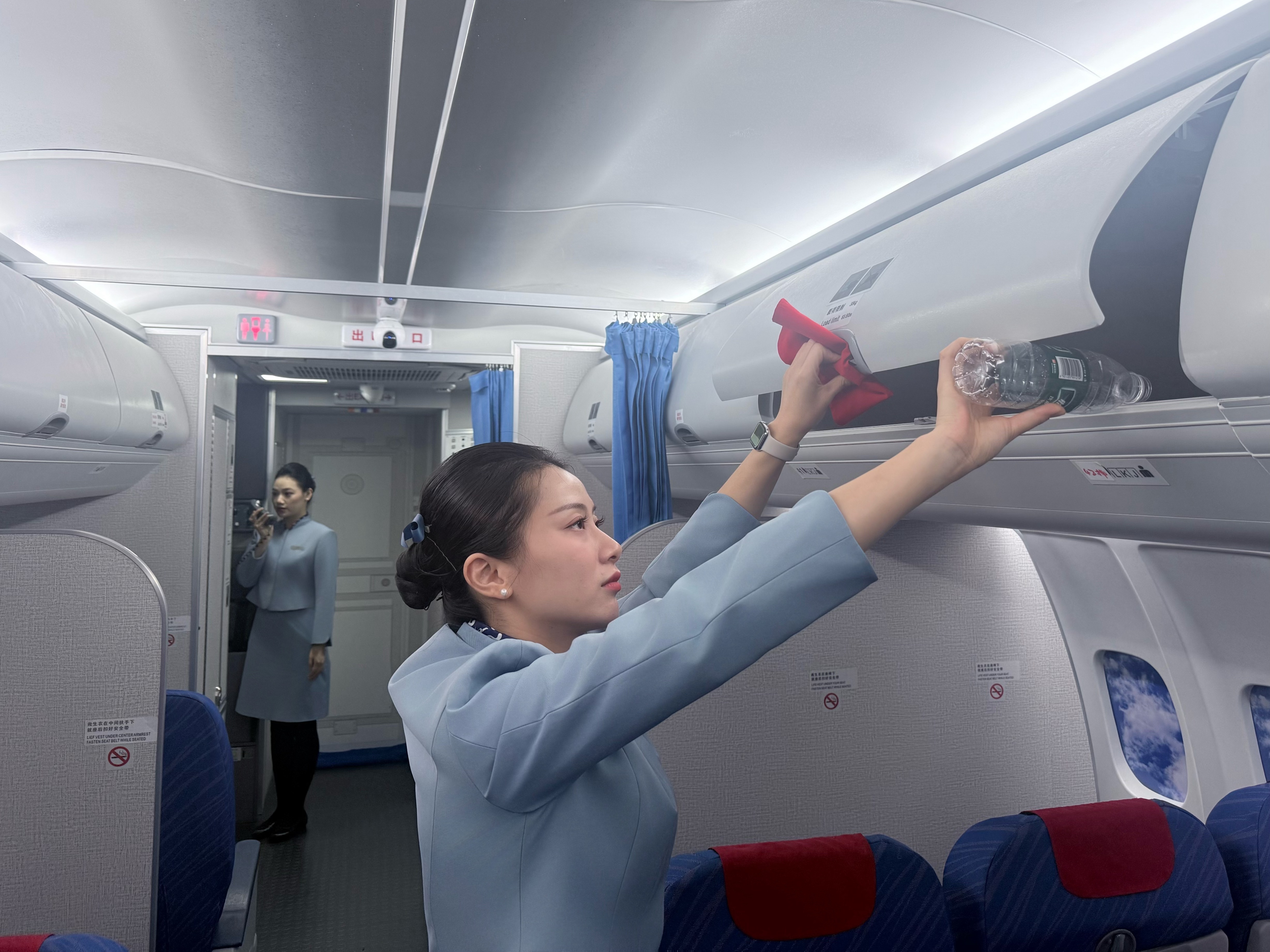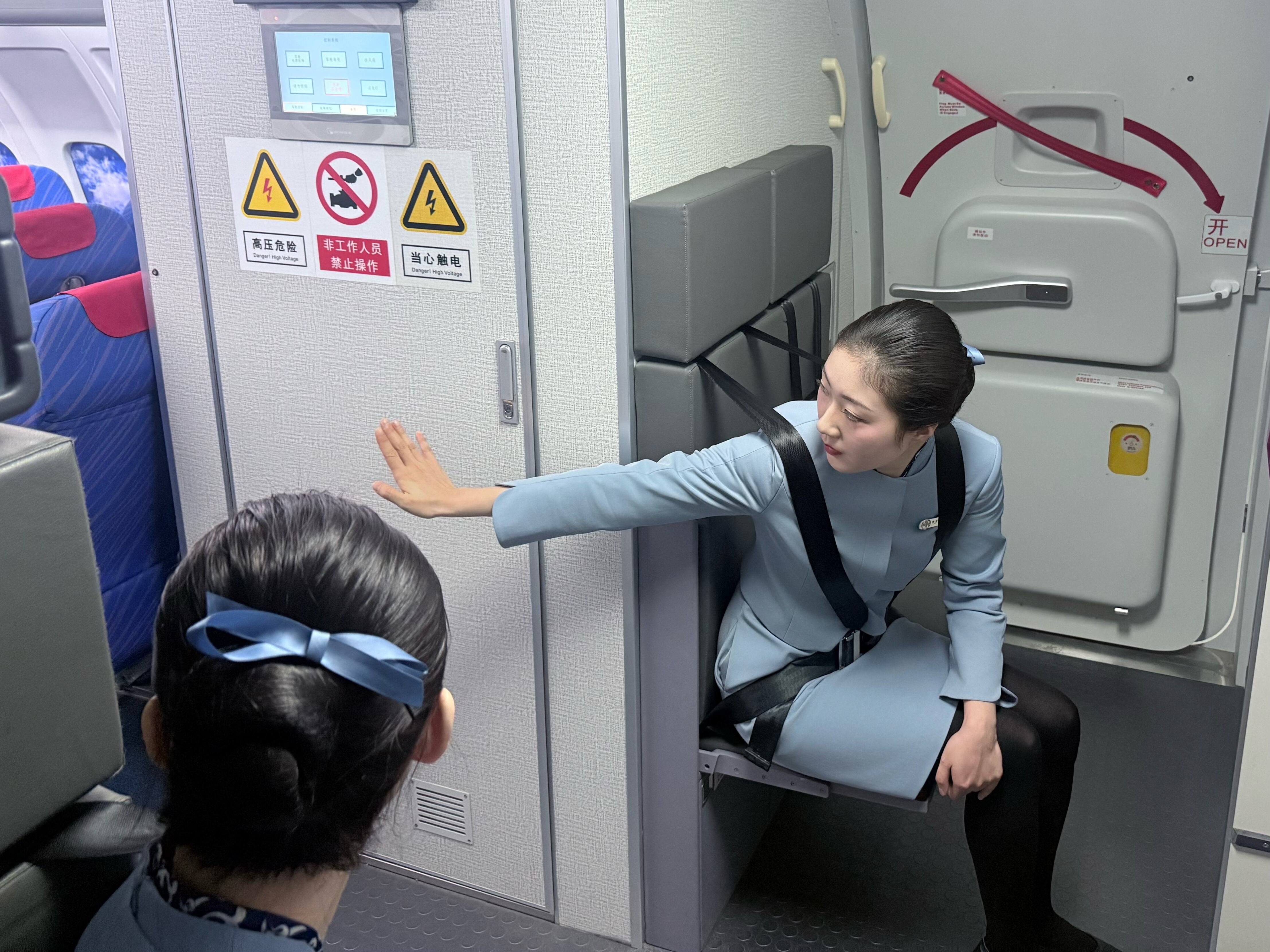 第一小组抽到“航班突发中度颠簸”情景。演练开始后,乘务组立即进入应急状态:首先通过广播发布立即就座并系好安全带的指令,告知旅客突发颠簸的情况,临近洗手间区域的客舱乘务员迅速响应,快速引导排队旅客返回座位,厨房区域的客舱乘务员立即固定餐车,防止物品滑落。整个过程指令清晰、分工明确,展现了组员们在突发情况下的专业素养。