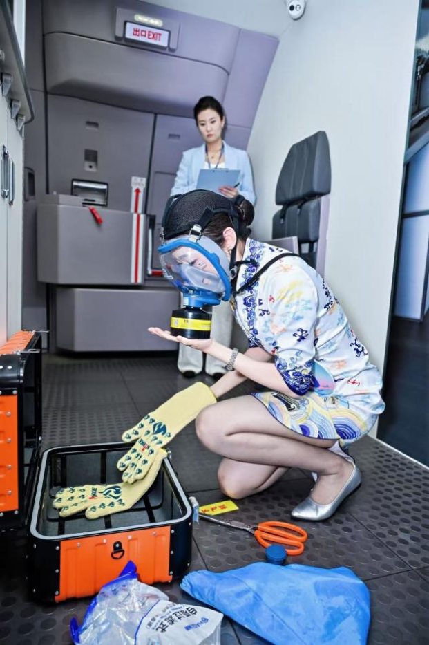 本次竞赛内容由理论考试和实际操作组成,实操技能考核又分为个人实操和团队实操两部分。赛题紧密围绕民航知识、应急医疗、锂电池处置、应急撤离四大核心领域精心设计,全方位、多角度考量参赛选手在真实工作场景中的应变智慧与业务功底。在考核科目方面,除了持续扩容的理论题库外,本次竞赛紧贴民航运行实际,新增机上锂电池防护设备考核。