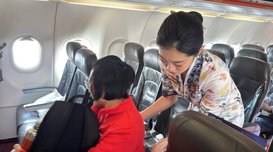 运动员们进入客舱后,乘务员向运动员旅客详细介绍机上洗手间的具体位置、呼唤铃的使用方法以及其他服务设备,确保旅客在航程中清晰知晓如何获取帮助。飞行期间,乘务组全程保持高度关注,随时留意并主动询问旅客需求,用细致的观察和及时的回应为运动员们的赛前旅程保驾护航。