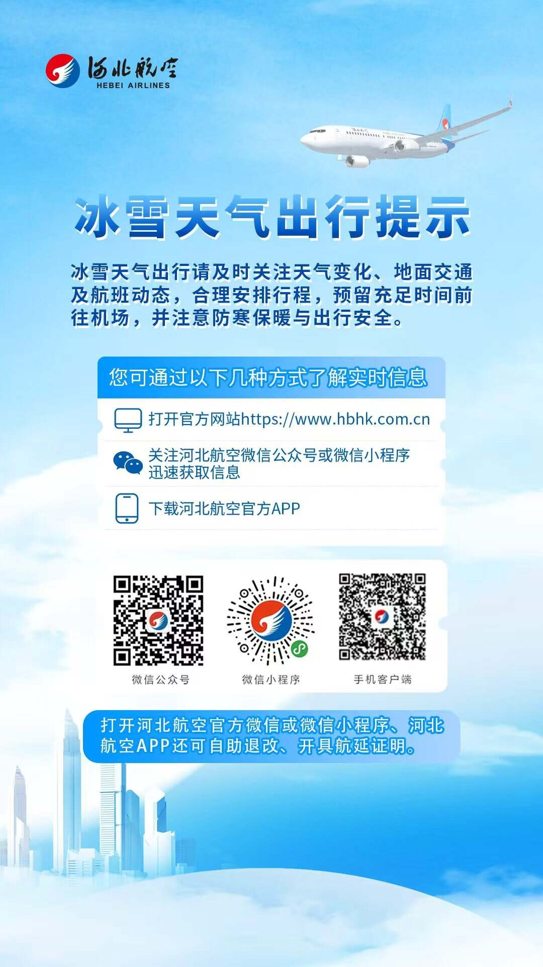 河北航空温馨提示广大旅客,冰雪天气出行请及时关注天气变化、地面交通情况及航班动态,合理安排行程,预留充足时间前往机场,注意防寒保暖和出行安全。如遇航班延误、取消等,需办理客票退改业务的旅客,可通过“河北航空”微信小程序、微信公众号或官方APP,自助快捷办理相关业务,享受高效便捷服务。